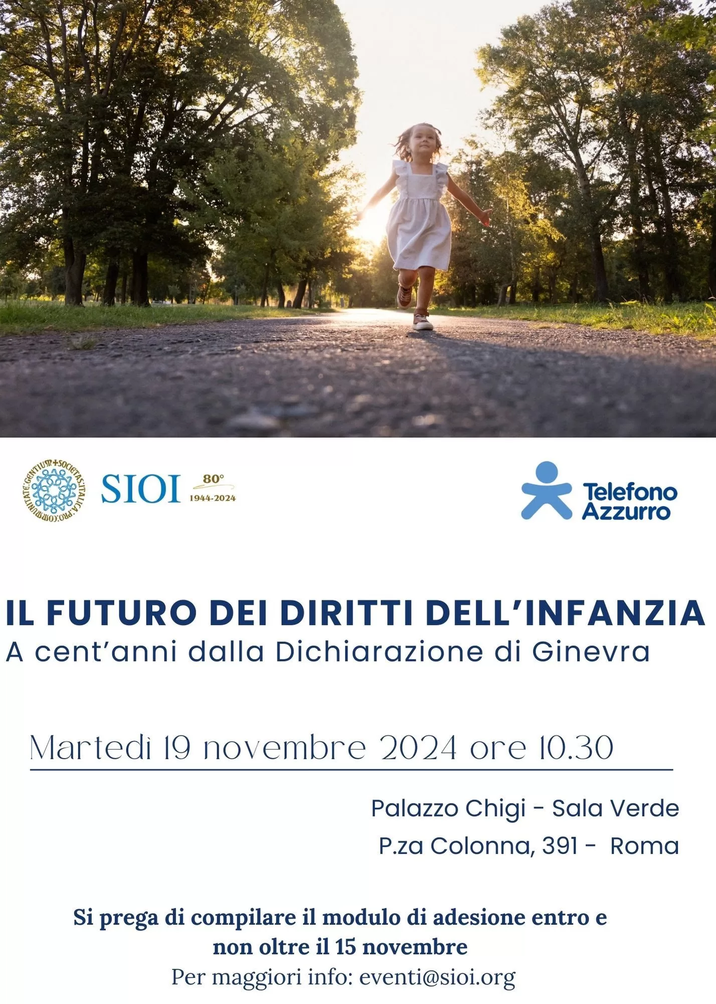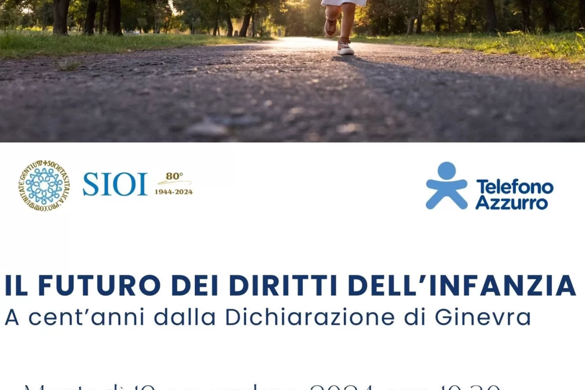 “Il futuro dei diritti dell’infanzia. A cent’anni dalla Dichiarazione di Ginevra” è il titolo dell’evento organizzato da Fondazione S.O.S Telefono Azzurro e Società Italiana per l’Organizzazione Internazionale (SIOI) martedì 19 novembre alle ore 10.30 a Palazzo Chigi in occasione della Giornata internazionale per i diritti dell’infanzia e dell’adolescenza. L’evento sarà occasione per celebrare i 100 anni dall’approvazione del primo documento internazionale in tema di diritti dell’infanzia, la Dichiarazione dei Diritti del Fanciullo (Geneva Declaration), promulgata dalla Società delle Nazioni nel 1924 e che rappresenta il punto di partenza di tutta la riflessione giuridico-sociale sulla protezione dell’infanzia del secolo scorso.