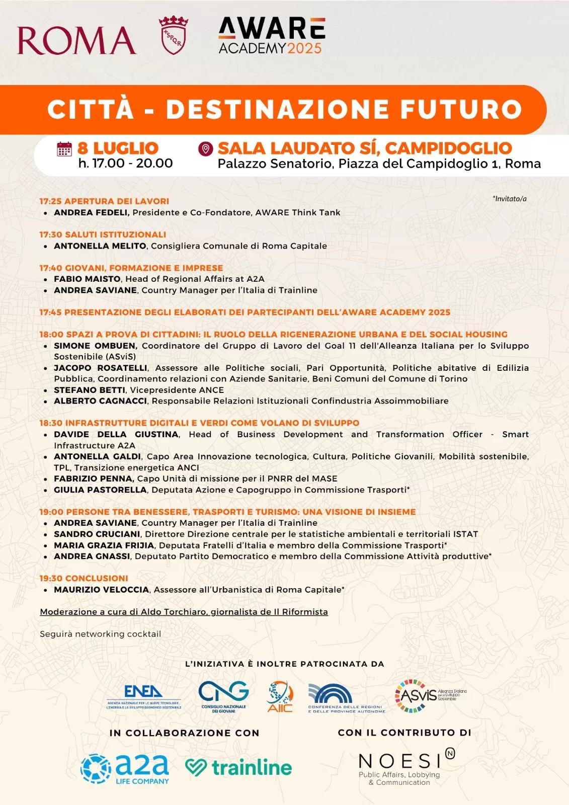 Martedì 8 luglio, dalle 17:00 alle 20:00, presso la Sala Laudato Sì in Piazza del Campidoglio a Roma, si terrà l’evento conclusivo dell’AWARE Academy 2025, dal titolo “Città – destinazione futuro”. L’incontro rappresenta il momento finale di un percorso formativo gratuito promosso da AWARE Think Tank, dedicato alla formazione di giovani under 30 sui temi delle trasformazioni urbane e delle smart communities.