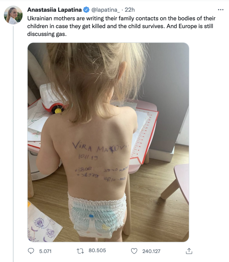 “Le mamme ucraine scrivono i contatti dei parenti sui corpi dei loro figli nel caso in cui vengano uccise e il bambino sopravviva. E l’Europa sta ancora discutendo del gas russo” è stato il commento della giornalista del Kyiv Independent Anastasiia Lapatina, tra i primi a condividere l’immagine su Twitter, ottenendo migliaia di retweet.