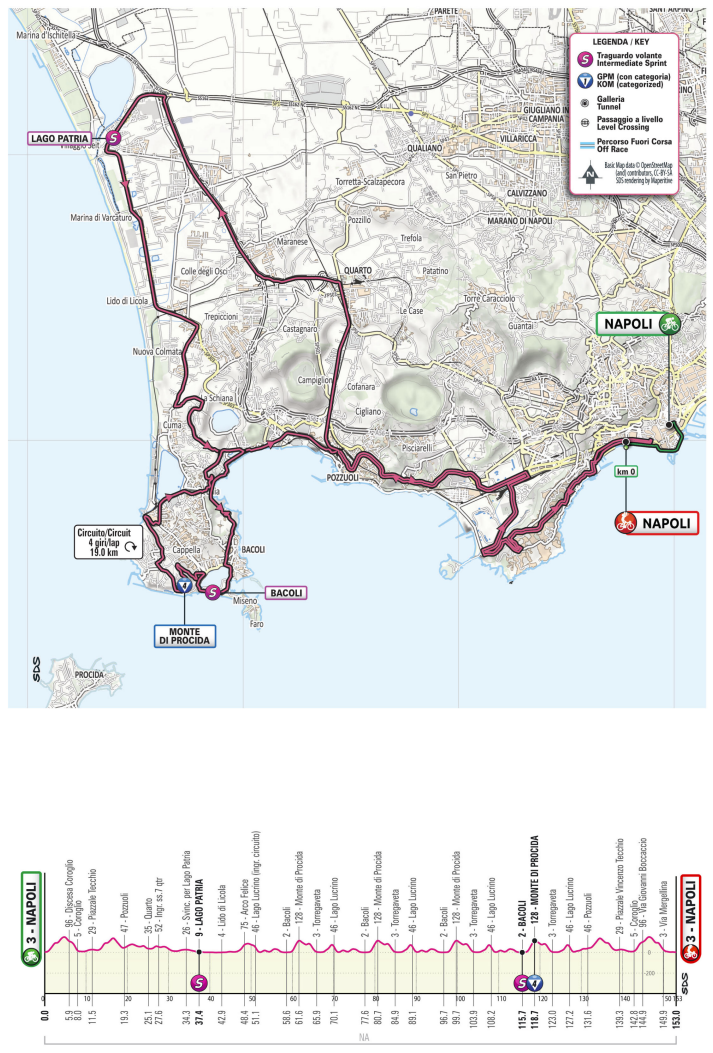 La partenza è prevista sul Lungomare cittadino per poi proseguire la corsa sulla collina di Posillipo e Fuorigrotta verso Bacoli e compiere un anello di 4 giri per il circuito del Monte di Procida di 19 km. I ciclisti rientreranno a Napoli attraverso le stesse strade dell’andata con la lunga discesa di via Petrarca per condurre al centro cittadino, percorrendo via Dohrn e via Caracciolo verso Est ed effettuare un giro di boa attorno a una rotatoria all’ultimo km ed infine via Caracciolo fino all’arrivo.