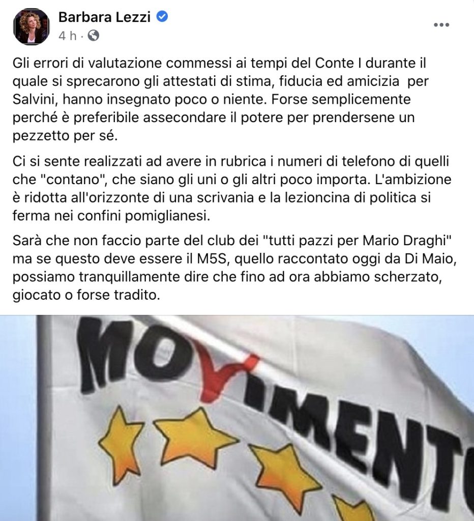 Parole e posizioni che non sono affatto piaciute all’ala più radicale e ortodossa del Movimento, rappresentata dalla pugliese Barbara Lezzi ex ministro per il Sud nel primo governo Conte. Su Facebook infatti la Lezzi sottolinea infatti che “se questo deve essere il M5S, quello raccontato oggi da Di Maio, possiamo tranquillamente dire che fino ad ora abbiamo scherzato, giocato o forse tradito”. L’ex ministro ricorda quindi “gli errori di valutazione commessi ai tempi del Conte I durante il quale si sprecarono gli attestati di stima, fiducia ed amicizia per Salvini, hanno insegnato poco o niente. Forse semplicemente perché è preferibile assecondare il potere per prendersene un pezzetto per sé”.
