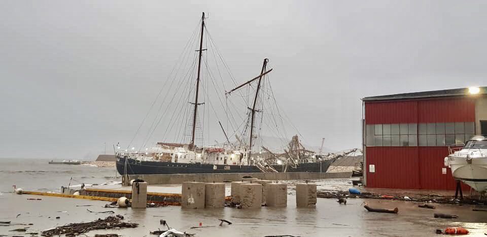 Vittima del maltempo anche uno dei simboli della città, “La Signora del Vento”, la nave scuola dell’Istituto Nautico Giovanni Caboto. Il veliero ha rotto gli ormeggi finendo nei pressi dei cantieri navali.