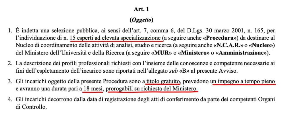 Usiamo il passato perché quel bando, diventato bersaglio di aspre critiche sui social network e scoperto da un articolo di Open, è stato ritirato. Con una nota, il Mur ha infatti comunicato che l’avviso pubblico “per la selezione, ai sensi dell’articolo 7, comma 6, del D.lgs. 30 marzo 2001, n. 165, di numero 15 esperti da inserire nel Nucleo di Coordinamento delle attività di analisi, di studio e di ricerca (N.C.A.R.)” è stato ritirato a causa di un errore tecnico nella sua stesura.
