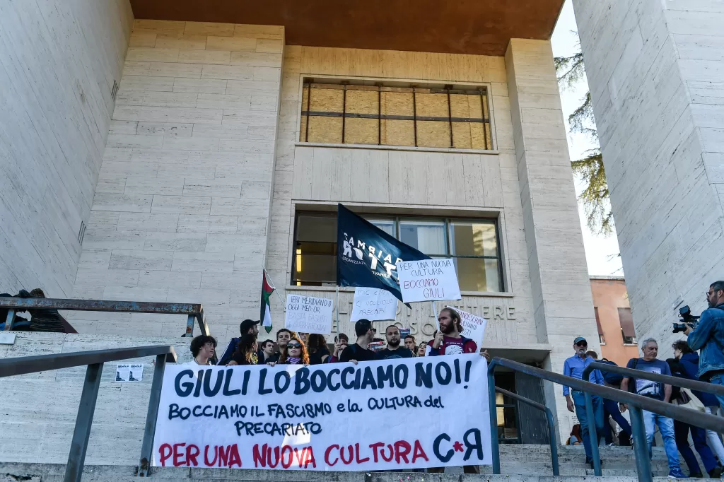 Tante contestazioni da parte del gruppo di Cambiare Rotta, che fuori dall’ateneo hanno esposto striscioni con su scritto “Giuli lo bocciamo noi, “contro il fascismo e la cultura del precariato”.
