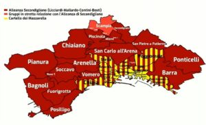 Nell’ambito del Convegno “La città e la camorra – Napoli e la questione criminale” ospitato nell’aula magna dell’università Federico II è stata presentata la mappa della criminalità organizzata: la città – secondo la ricostruzione della Procura – è nelle mani del cartello dell’Alleanza di Secondigliano che domina da Posillipo a Barra, passando per la zona occidentale, quella collinare e la periferia Nord. Al cartello dei Mazzarella restano pezzi dei quartieri Chiaia, Poggioreale, Porto, Mercato e poco altro. Rosso e giallo i colori della nuova mappa ma sarebbe altrettanto interessante pensare alla creazione di una cartina dei fattori sociologici che hanno portato la criminalità organizzata a dividersi la città. «Più che parlare di emergenza o infiltrazioni camorristiche bisogna parlare di elemento strutturale del tessuto sociale. Non di un mero contenitore di violenza urbana» ha spiegato Melillo.