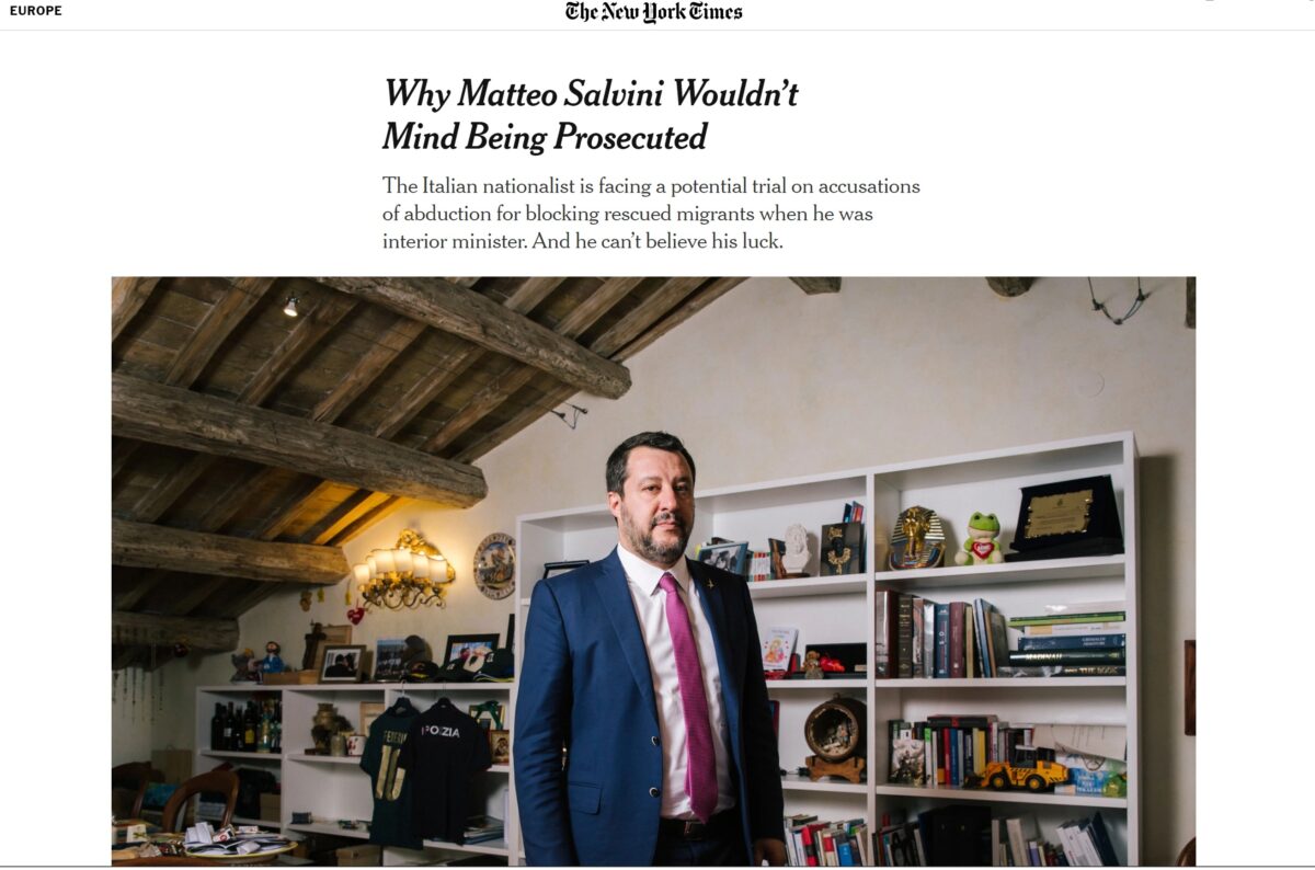 L’articolo è firmato dal giornalista Jason Horowitz ha fatto un’attenta analisi della situazione politica italiana con un focus sull’immigrazione, sottolineando come per Salvini finire sotto processo potrebbe rivelarsi un vantaggio dal punto di vista politico.