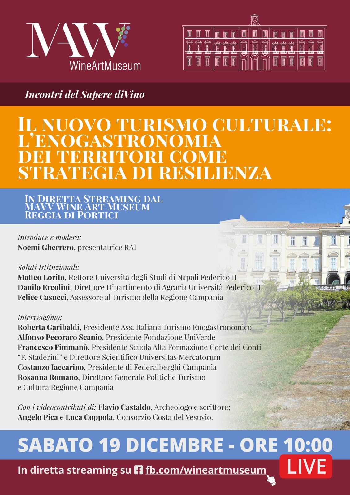 Il nuovo turismo culturale: l’enogastronomia dei territori come strategia di resilienza” è il tema dell’importante confronto promosso dal MAVV – Wine Art Musem, per il ciclo degli “Incontri del Sapere diVino, in programma sabato 19 dicembre, dalle ore 10, in diretta streaming sui canali social del MAVV, dalla sede del Museo dell’Arte del Vino e della Vite alla Reggia di Portici. L’iniziativa si inserisce nell’ambito del Wine Art Fest.