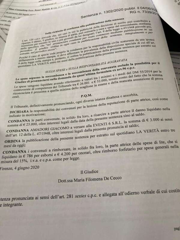 Il padre di Matteo Renzi vince la causa per diffamazione nei confronti del giornale di Maurizio Belpietro ‘La Verità’ e del giornalista Giacomo Amadori. Tiziano Renzi e la sua società ‘Eventi 6’ hanno infatti ottenuto dal Tribunale di Firenze la condanna al pagamento di 25mila euro, mentre il solo Amadori dovrà versare alla ‘Eventi 6’ una somma di 3mila euro.