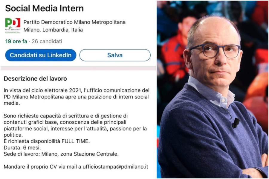Peccato che sole 24 ore dopo su LinkedIn, il social ‘del lavoro’, il Partito Democratico di Milano abbia pubblicato un annuncio in cui si cerca un “intern” per la posizione di social media “in vista del ciclo elettorale 2021”.