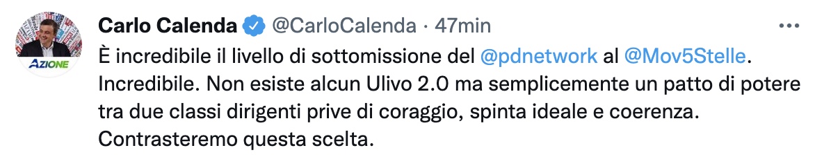 Di tutt’altro tono sono invece le parole di chi, del “campo largo” lettiano, potrebbe far parte. Carlo Calenda, leader di Azione, stronca senza mezzi termini l’ipotesi di un candidatura di Conte alle suppletive di Roma. L’ex candidato sindaco di Roma giudica infatti “incredibile il livello di sottomissione del Pd al Movimento Cinquestelle”. Secondo Calenda “non esiste alcun Ulivo 2.0 ma semplicemente un patto di potere tra due classi dirigenti prive di coraggio, spinta ideale e coerenza. Contrasteremo questa scelta”.