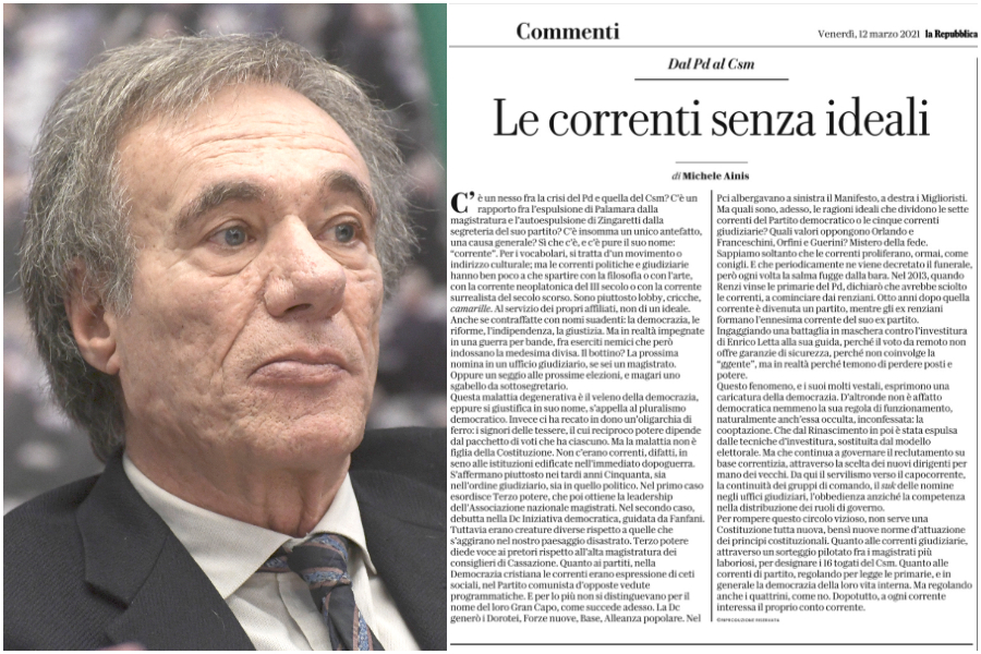 Un importante articolo del professor Ainis (Le correnti senza ideali su Repubblica del 12 marzo) solleva questioni di grande rilievo sulla crisi della magistratura italiana o, meglio, di quella sua specifica rappresentanza professionale che sono le cosiddette correnti. La trama fitta delle osservazioni che l’illustre studioso svolge a proposito dell’identità delle fibrillazioni che toccano, insieme, la magistratura associata e un importante formazione politica del Paese (il PD) trova un punto di convergenza nell’azione, a suo dire nefasta, che le correnti hanno svolto e svolgerebbero in seno a formazioni – la magistratura e i partiti – di primario rango costituzionale.