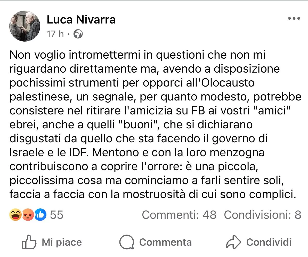 Luca Nivarra, ordinario di Diritto civile e decano del Dipartimento, ha scritto su Facebook: «Non voglio intromettermi in questioni che non mi riguardano direttamente ma, avendo a disposizione pochissimi strumenti per opporci all’Olocausto palestinese, un segnale, per quanto modesto, potrebbe consistere nel ritirare l’amicizia su FB ai vostri “amici” ebrei, anche a quelli “buoni”, che si dichiarano disgustati da quello che sta facendo il governo di Israele e le IDF. Mentono e con la loro menzogna contribuiscono a coprire l’orrore: è una piccola, piccolissima cosa ma cominciamo a farli sentire soli, faccia a faccia con la mostruosità di cui sono complici».