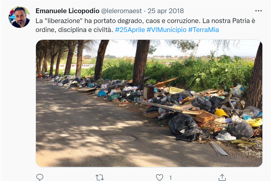 Il neo consigliere ha militato in passato in Forza Nuova, partecipando a ronde notturne per garantire “sicurezza ai cittadini”. Mostrava pubblicamente la celtica d’oro al collo, senza nasconderla. E nel frattempo, tra una foto e l’altra, pubblicava tweet contro la Liberazione dal fascismo e gli ebrei.