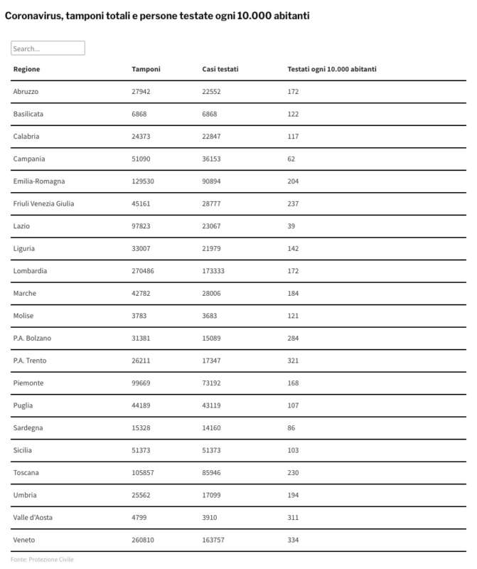 Al contrario Sicilia e Basilicata hanno comunicato lo stesso numero per tamponi positivi e persone testate. Se il dato fosse corretto, vorrebbe dire che entrambe le regioni hanno effettuato i test solo per ricercare la positività al Covid-19, e nessuno per accertare la guarigione. Ipotesi che implicherebbe però che i “guariti” comunicati dalle due regioni siano solo persone che sono state dimesse o non mostrano più sintomi, e non i pazienti “virologicamente guariti”, gli unici veri guariti secondo le linee guida del Consiglio Superiore di Sanità.