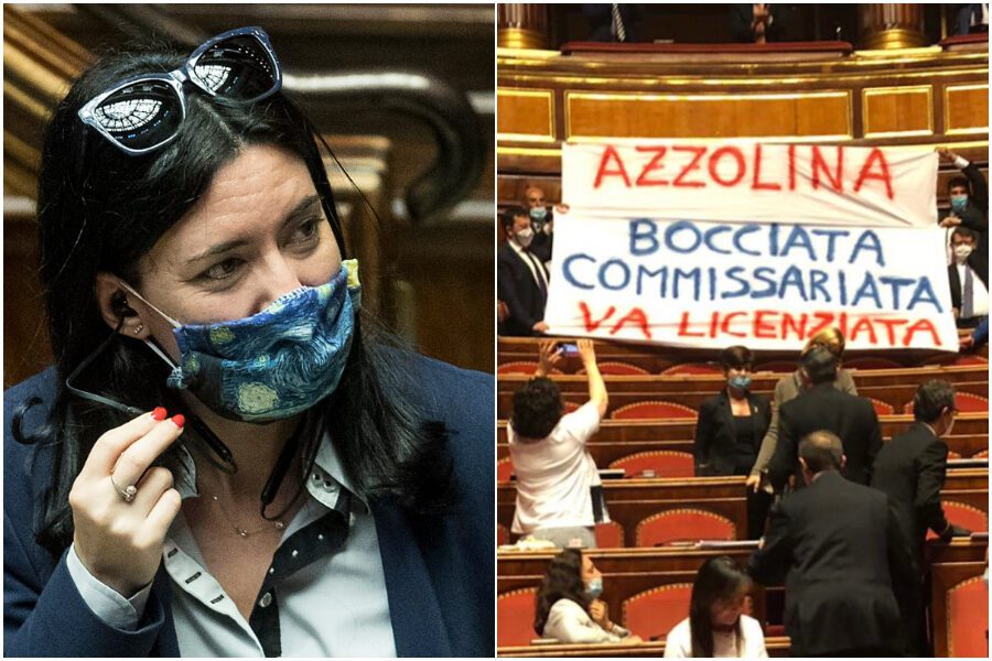 Bagarre al Senato in occasione del question time della ministra dell’Istruzione Lucia Azzolina. Alcuni onorevoli della Lega hanno esposto uno striscione: “Azzolina bocciata, commissariata, va licenziata”. Per pochi minuti l’aula si è trasformata in una curva da stadio. Il Carroccio aveva già ampiamente espresso in più occasioni la sua insoddisfazione per l’operato della ministra.