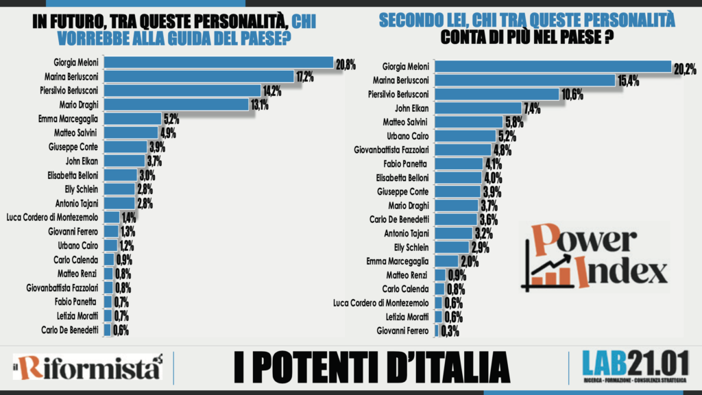 Alla domanda ‘chi vorresti alla guida del Paese’, secondo Lab21.01 gli italiani sembrano avere le idee chiare: la premier è tallonata dai due eredi del Cavaliere, Marina e Pier Silvio