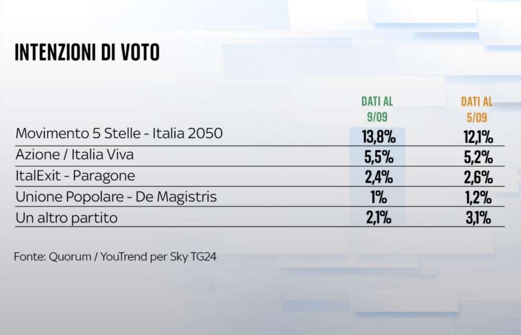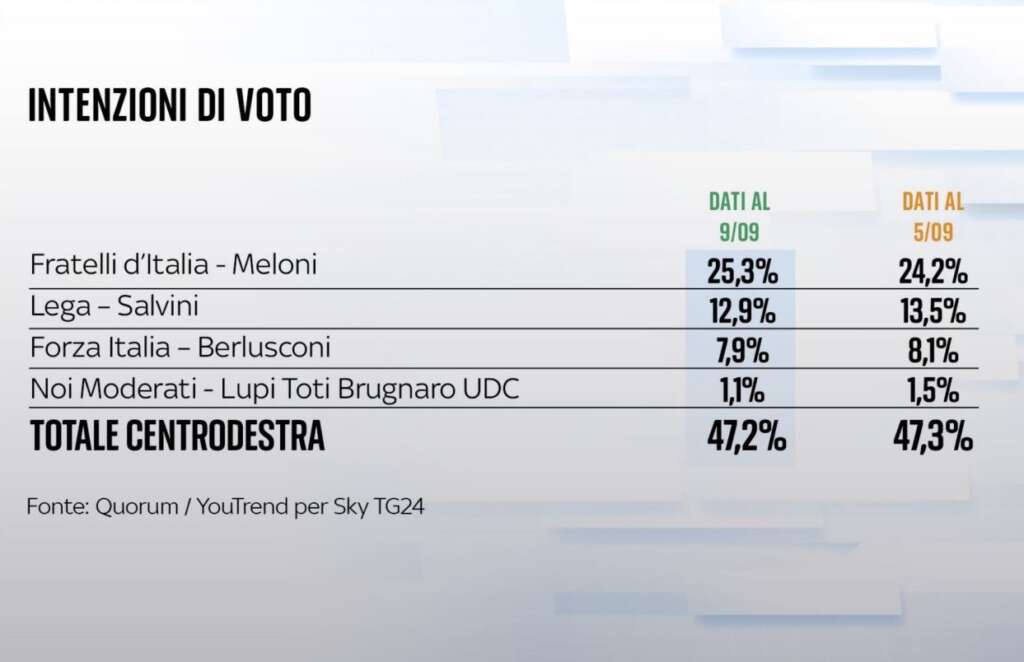Il Carroccio di Matteo Salvini si ferma infatti a quota 12,9 per cento, ancora in calo rispetto al precedente 13,5 sondato il 5 settembre. Nella ‘classifica’ di YouTrend per SkyTg24 in seconda posizione resta il Partito Democratico, ma le speranza Dem di scalzare la Meloni dal primo posto stando ai trend dei sondaggi sembrano ormai ridotte visto la tendenza di Letta e soci discendente. Il PD è infatti quotato al 21,2%, ma in calo rispetto al 21,9 per cento di pochi giorni fa.