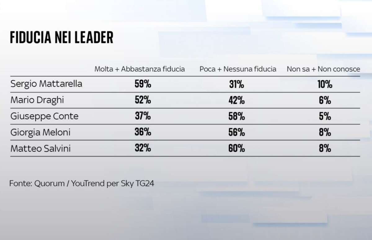 In base al sondaggio di Quorum YouTrend, le figure in cui gli italiani ripongono maggiormente fiducia sono ancora il presidente della Repubblica Sergio Mattarella (59%) e il presidente del Consiglio uscente Mario Draghi (52%). Seguono i leader di partito Giuseppe Conte (37%), Giorgia Meloni (36%) e Matteo Salvini (32%). Alle loro spalle Silvio Berlusconi (31%), Emma Bonino (24%), Enrico Letta (23%), Luigi Di Maio (20%) e Carlo Calenda (17%).