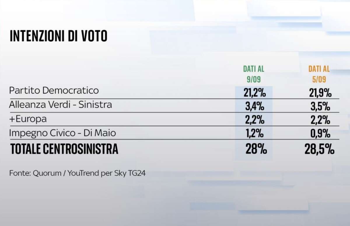 Il Carroccio di Matteo Salvini si ferma infatti a quota 12,9 per cento, ancora in calo rispetto al precedente 13,5 sondato il 5 settembre. Nella ‘classifica’ di YouTrend per SkyTg24 in seconda posizione resta il Partito Democratico, ma le speranza Dem di scalzare la Meloni dal primo posto stando ai trend dei sondaggi sembrano ormai ridotte visto la tendenza di Letta e soci discendente. Il PD è infatti quotato al 21,2%, ma in calo rispetto al 21,9 per cento di pochi giorni fa.