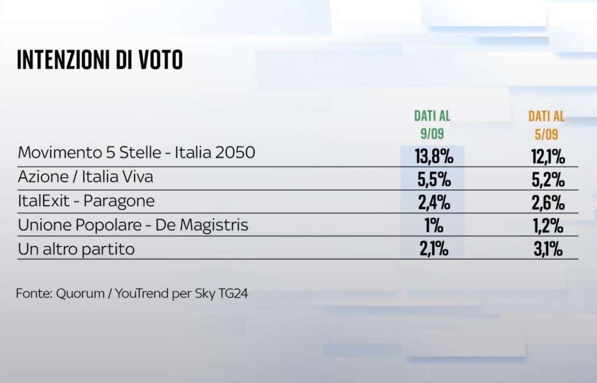 Sul ‘podio’ si porta invece il Movimento 5 Stelle di Giuseppe Conte: i pentastellati tornati “di lotta” e non più “di governo” stanno rosicchiando voti a sinistra e al Pd, riuscendo così a portarsi al 13,8% e guadagnando quasi due punti nelle intenzioni di voto.