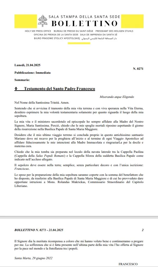 Sepoltura che è l’unica volontà testamentaria voluta da Papa Francesco. “Chiedo che le mie spoglie mortali riposino aspettando il giorno della risurrezione nella Basilica Papale di Santa Maria Maggiore. Desidero che il mio ultimo viaggio terreno si concluda proprio in questo antichissimo santuario Mariano dove mi recavo per la preghiera all’inizio e al termine di ogni Viaggio Apostolico ad affidare fiduciosamente le mie intenzioni alla Madre Immacolata e ringraziarLa per la docile e materna cura”.