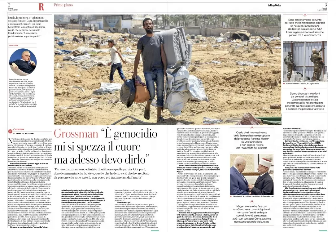 Ieri la Repubblica intitolava così un’intervista allo scrittore israeliano David Grossman: “Grossman: è genocidio. Mi si spezza il cuore ma adesso devo dirlo”. Un volgare falso. Perché è vero che, nel corso dell’intervista resa alla giornalista di Repubblica, Francesca Caferri, il grande scrittore usa più volte quella parola, “genocidio”.