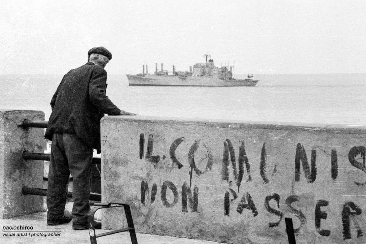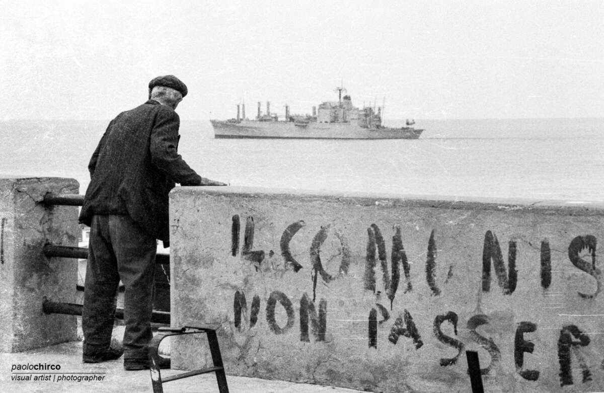 Un vecchio che piscia in mare, una scritta sbiadita e sullo sfondo una nave militare americana. Questo è ciò che vedete. Tutto in bianco e nero, non potrebbe essere altrimenti. E non tanto perché è il 1978 quando questa foto viene scattata ma perché l’immagine esce fuori da un archivio e gli archivi sono per definizione senza colori, anche quando sono digitalizzati sembrano portare la polvere addosso. Facile dirsi che arriva da un mondo che non esiste più, in un tempo maledetto e immobile. Al contrario tutto quello che agita il dibattito politico in fondo viene da lì: il comunismo e il suo anti (ovvero la guerra fredda), il paese vecchio e il paese vassallo, la guerra americana per non dire che era anche italiana, esattamente come oggi.