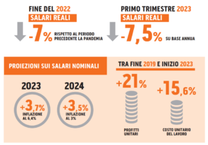 «Alla fine del 2022 – avverte l’organismo internazionale – i salari reali erano calati del 7% rispetto al periodo precedente la pandemia. La discesa è continuata nel primo trimestre del 2023, con una diminuzione su base annua del 7,5%». Gli stipendi stanno lentamente inseguendo l’inflazione, ma senza riuscire a tenerne il passo. Per un verso questo è frutto proprio del fatto che il nostro Paese è tra quelli con la più alta presenza di contrattazione collettiva, che fisiologicamente non riesce ad essere al tempo con l’inflazione.