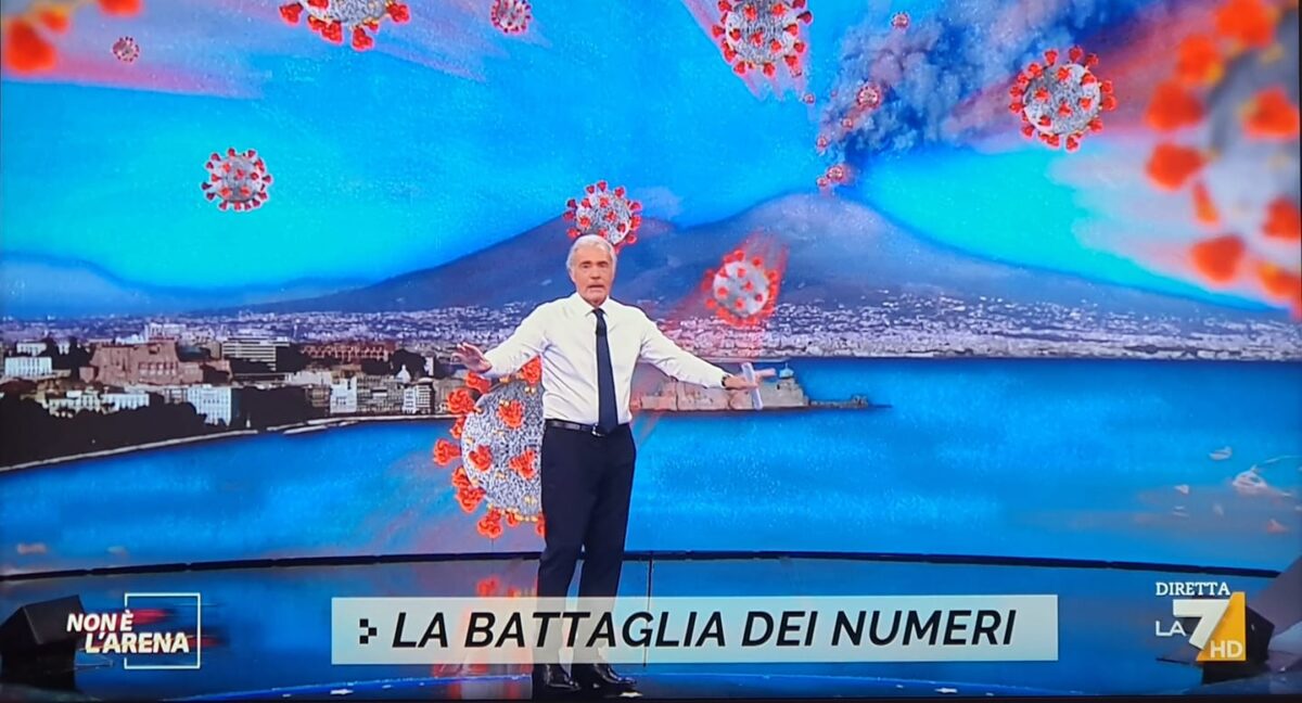 A rendere tutto ancora più inquietante anche la presenza in collegamento video del sindaco di Napoli Luigi de Magistris, che nel corso della trasmissione non ha mai proferito parola sulla scelta di Giletti e ‘Non è l’Arena’ di utilizzare il Vesuvio con quel fine.