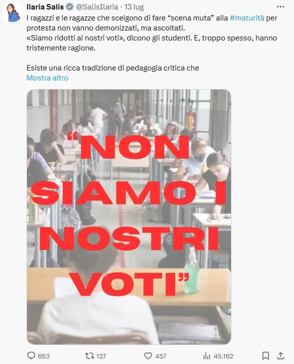 Anzi, proprio la scelta di 5 studenti, su un totale di 524.415 che quest’anno hanno affrontato l’esame, di “fare scena muta alla maturità… vanno ascoltati e non demonizzati”, diventa l’ennesima prova della specchiata scelta giacobina. Così, in un post su X, l’eurodeputata di Avs condanna il Ministro dell’Istruzione che, “invece di aprire un confronto, minaccia punizioni e invoca la repressione. È l’unico linguaggio che questo governo conosce.