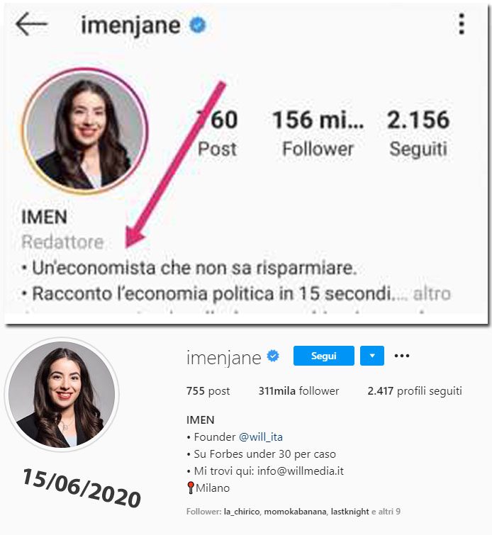 La pubblicazione dell’articolo da parte di Dagospia fa compiere a Imen Jane un repentino passo indietro: scompare infatti dal suo profilo verificato di Instagram la descrizione “economista”. Imen, che con la notorietà acquisita sui social è riuscita ad entrare nella lista dei talenti under 30 della rivista Forbes e a raccogliere per 1,2 milioni di euro da diversi investitori per lanciare il canale social di economia “Will”, è costretta a fare un passo indietro.
