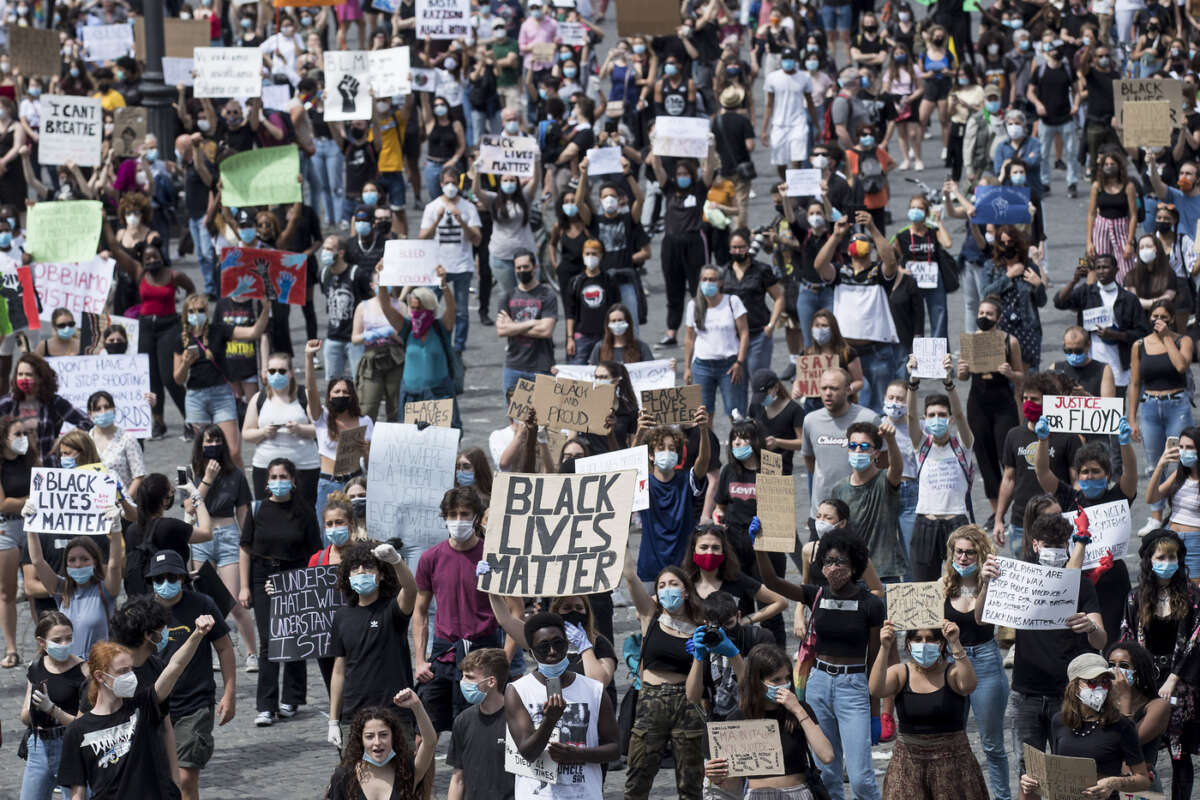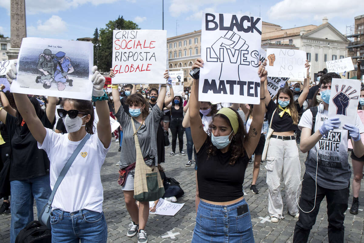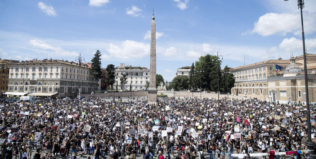 Rigorosamente distanziati e con le mascherine, giovani e meno giovani hanno occupato pacificamente piazza del Popolo con manifesti e cartelli fatta in casa per dimostrare la solidarietà italiana nei confronti della popolazione afroamericana negli Stati Uniti, in rivolta dopo l’omicidio per mano della polizia del 45enne George Floyd a Minneapolis.