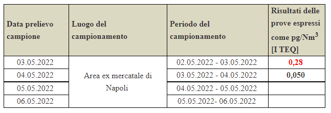 Prosegue il monitoraggio delle diossine in relazione all’incendio che lo scorso 1 maggio ha interessato il sito dell’ex mercato ortofrutticolo in zona Gianturco a Napoli, effettuato mediante un campionatore di aria ambiente ad alto volume, posizionato nei pressi del sito dell’incendio. Si rendono noti gli esiti analitici del secondo ciclo di campionamento, effettuato in data 3-4 maggio 2022 (il risultato del ciclo di campionamento 2-3 maggio, già diffuso in precedenza, è comunque riportato in questo comunicato).