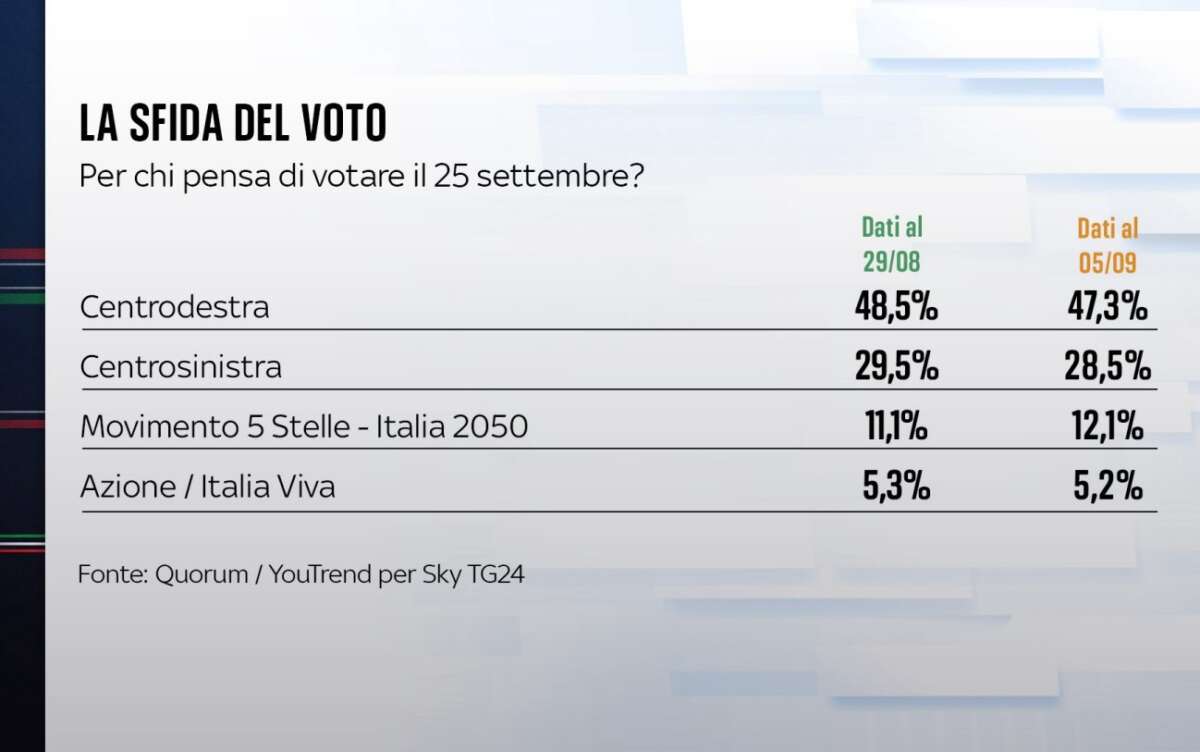 Proiezioni di voto: la coalizione del centrodestra si stacca sempre di più dal centrosinistra. La sfida, aggiornata a oggi, registra un 47,3% a un 28,5%. Fratelli d’Italia resta il primo partito, al 24,2%. Staccato di oltre due punti il Partito Democratico, al 21,9%. Seminati gli altri partiti: in calo al 13,5% la Lega, cresce fino al 12,1% il Movimento 5 Stelle, scende all’8,1% Forza Italia. Il Terzo Polo Azione/Italia Viva è al 5,2%. Verdi e Sinistra Italiana al 3,5%. Italexit di Gianluigi Paragone al 2,6%. + Europa al 2,2%. Unione Popolare di Luigi de Magistris all’1,2%. Impegno Civico di Luigi Di Maio allo 0,9%.