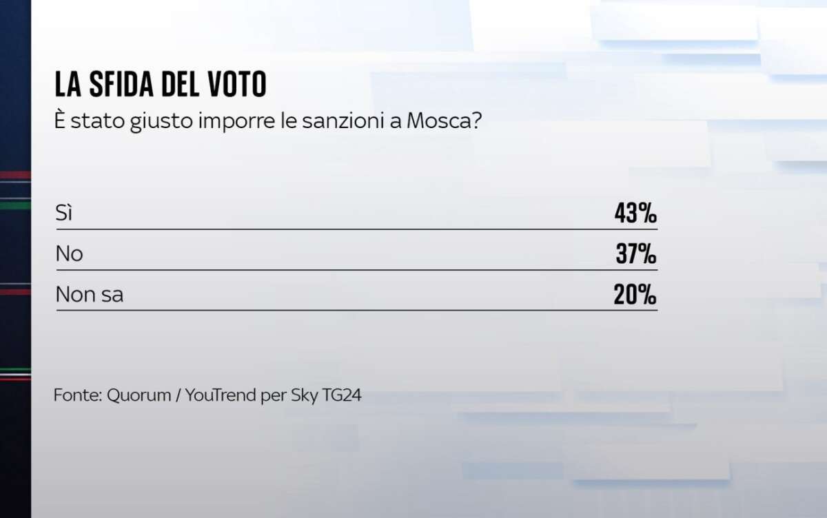 All’indomani del Forum di Cernobbio, con tutti i leader politici in corsa, e le divergenze tra Fratelli d’Italia e Lega sulle sanzioni a Mosca, il sondaggio registra una spaccatura sostanziale sulla questione ucraina: il 43% degli intervistati giudica giuste le sanzioni alla Russia, il 37% non le giudica giuste, il 20% non si esprime. A guardare gli elettorati, i più favorevoli alle sanzioni (71%) sono gli elettori di centrosinistra, mentre il 39% dei favorevoli del centrodestra sono contrastati da un 45% di sfavorevoli.