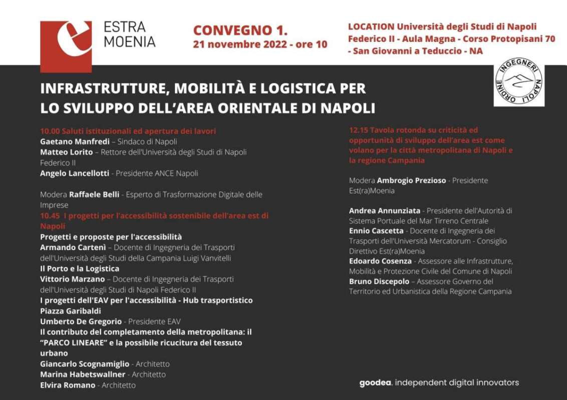 In programma interventi di Armando Cartenì, docente di Ingegneria dei Trasporti dell’Università degli Studi della Campania “Luigi Vanvitelli”; Vittorio Marzano, docente di Ingegneria dei Trasporti dell’Università degli Studi di Napoli Federico II; Umberto De Gregorio, presidente EAV; Andrea Annunziata, presidente dell’Autorità di Sistema Portuale del Mar Tirreno Centrale; Ennio Cascetta, docente di Ingegneria dei Trasporti dell’Università Mercatorum; Edoardo Cosenza, assessore alle Infrastrutture, Mobilità e Protezione Civile del Comune di Napoli; Bruno Discepolo, assessore Governo del Territorio ed Urbanistica della Regione Campania; gli architetti Giancarlo Scognamiglio, Marina Habetswallner ed Elvira Romano. Modera Raffaele Belli, esperto di Trasformazione Digitale delle Imprese.