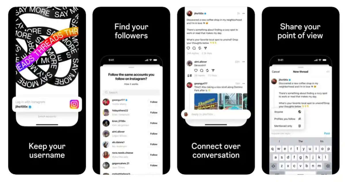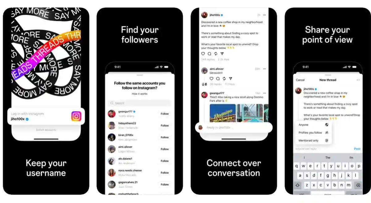 Le schermate suggeriscono che gli utenti potranno utilizzare il proprio account Instagram per accedere a Threads e seguire i contatti esistenti. L’applicazione sembra condividere un’interfaccia utente simile a quella di Twitter, con funzioni simili che includono il reposting, il like e la possibilità di limitare chi può rispondere ai post.