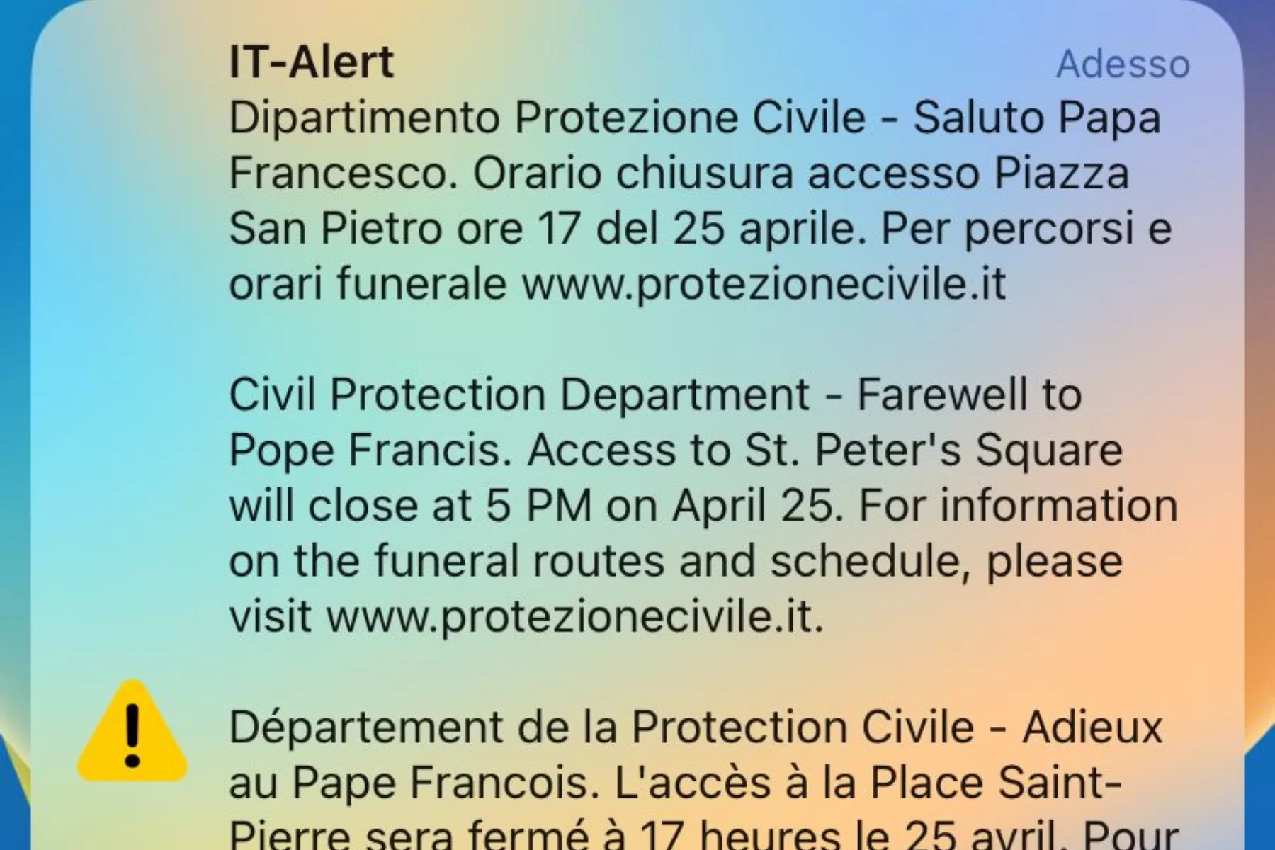 It-Alert inviato su tutti i telefonini presenti nella città di Roma per comunicare la chiusura di piazza San Pietro a partire dalle 17 di oggi, venerdì 25 aprile, mentre la Basilica alle 18, un’ora in anticipo rispetto a quanto stabilito inizialmente nei giorni scorsi.
