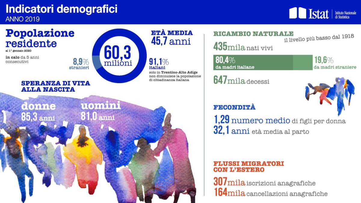 Gli italiani continuano a diminuire. A certificare il calo dei residenti è l’Istat nel suo consueto report sugli indicatori demografici. Al primo gennaio 2020 infatti i residenti ammontano a 60 milioni 317mila, 116mila in meno su base annua, mentre aumenta il divario tra nascite e decessi: per 100 persone decedute arrivano soltanto 67 bambini (dieci anni fa erano 96).