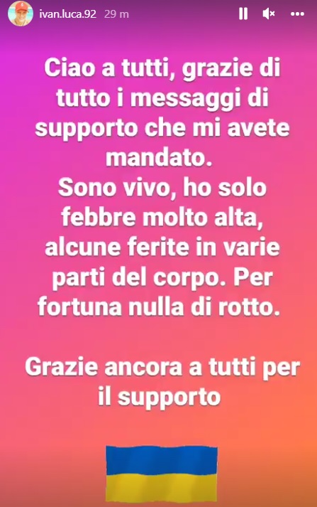 Lo stesso Ivan ha confermato sul proprio profilo Instagram di stare bene e di essere ricoverato in ospedale. “Sono vivo, ho solo febbre molto alta, alcune ferite in varie parti del corpo. Per fortuna nulla di rotto”, ha scritto su Instragam l’ex calciatore e foreign fighter italiano.