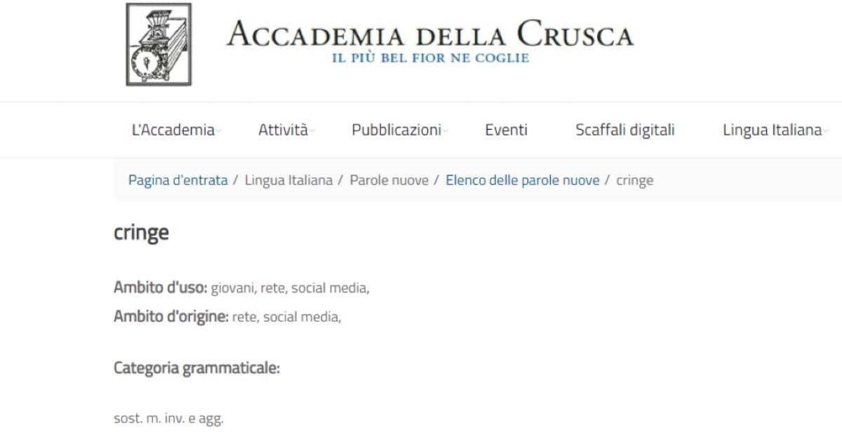 Cosa è successo quindi? Come ricostruisce Valigia Blu, la Crusca ha pubblicato nella sua sezione ‘Parole nuove’ una scheda sul termine Cringe e un articolo collegato per approfondire il tema. Cringe, spiegato in poche parole, vuole dire essenzialmente “imbarazzo”, o nell’uso come aggettivo “cosa che provoca imbarazzo”.