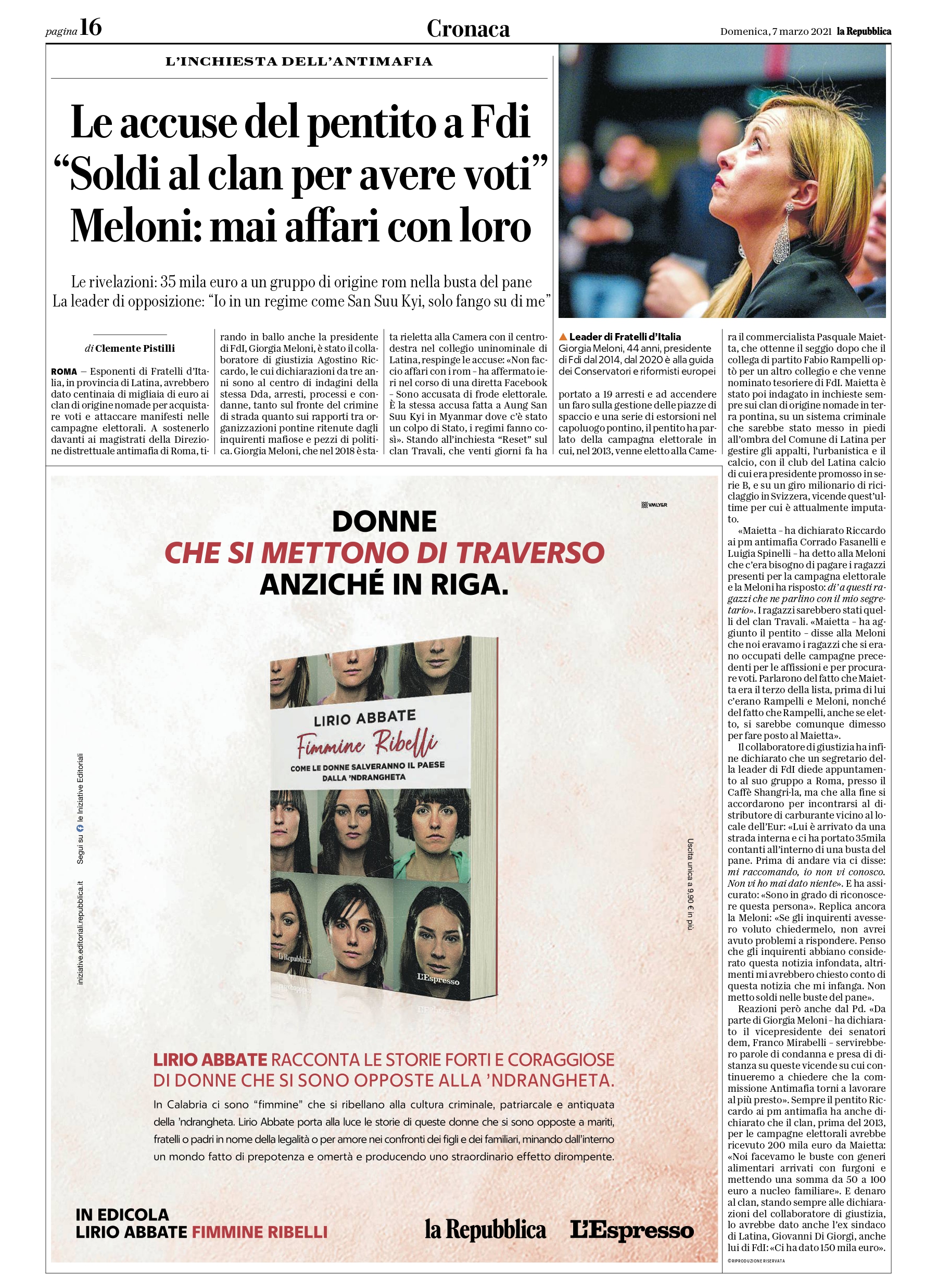 È una storiella che potremmo definire persino ridicola, se non fosse per il fatto che viene definita “di mafia”, una mafietta di provincia nella zona di Latina, in cui si mescolano piccole storie di droga, denunce di voti comprati e di manifesti fatti attaccare da ragazzini rom. L’impressione è che vicende di piccolissimo cabotaggio siano state riverniciate con due mani di biacca, la patente di mafiosità ( destinata a cadere al processo) e il nome altisonante di un segretario di partito. C’è l’inchiesta che si chiama “Reset”, nome pretenzioso che pare creato da Gratteri, c’è il pentito di periferia che è stato ritenuto credibile in un precedente processetto, c’è la Dda e c’è il cronista. Nella redazione romana di Repubblica il giornalista scrive tre pezzi nella stessa giornata: uno per spiegare che il pentito ha “tirato in ballo” Giorgia Meloni, in quanto un suo segretario avrebbe ficcato 35.000 euro in un sacchetto del pane (ricordate il sacchetto di mele di Ottaviano Del Turco?) per pagare voti comprati e l’affissione di manifesti elettorali alle elezioni politiche del 2013.