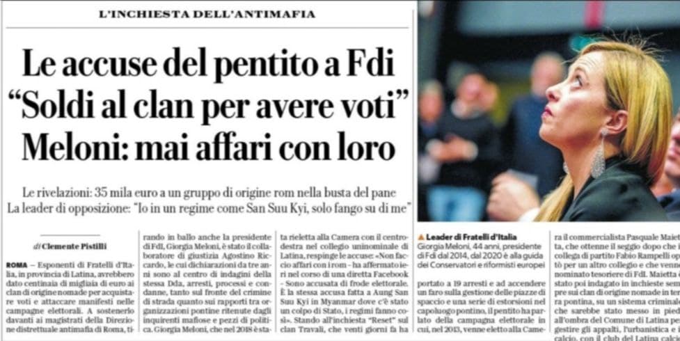 È una storiella che potremmo definire persino ridicola, se non fosse per il fatto che viene definita “di mafia”, una mafietta di provincia nella zona di Latina, in cui si mescolano piccole storie di droga, denunce di voti comprati e di manifesti fatti attaccare da ragazzini rom. L’impressione è che vicende di piccolissimo cabotaggio siano state riverniciate con due mani di biacca, la patente di mafiosità ( destinata a cadere al processo) e il nome altisonante di un segretario di partito. C’è l’inchiesta che si chiama “Reset”, nome pretenzioso che pare creato da Gratteri, c’è il pentito di periferia che è stato ritenuto credibile in un precedente processetto, c’è la Dda e c’è il cronista. Nella redazione romana di Repubblica il giornalista scrive tre pezzi nella stessa giornata: uno per spiegare che il pentito ha “tirato in ballo” Giorgia Meloni, in quanto un suo segretario avrebbe ficcato 35.000 euro in un sacchetto del pane (ricordate il sacchetto di mele di Ottaviano Del Turco?) per pagare voti comprati e l’affissione di manifesti elettorali alle elezioni politiche del 2013.