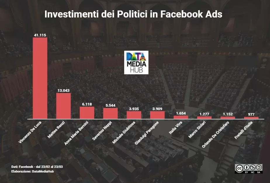 Unendo questi elementi – genuinità, linguaggio, appuntamento fisso, attesa, engagement – come puntini di un disegno, riesce senza particolari problemi a porsi al centro della scena politica. Come accade per Conte a Roma, in Campania (e anche fuori, come detto), è lui a dettare l’agenda. È bene però approfondire anche un ulteriore elemento soltanto accennato: la consiliatura in Regione Campania è scaduta nel mese di maggio. Le elezioni sono state rinviate. Che De Luca non abbia mai pensato che la gestione dell’emergenza Covid avrebbe avuto risvolti sull’appuntamento con le urne sembra fantascienza. In questo senso, nei suoi monologhi si scorgono alcuni tratti di comunicazione elettorale piuttosto che di comunicazione politica. In particolare, si può ricondurre a questo il suo tono solenne, grave e drammatico, tipico proprio dei discorsi da campagna elettorale. Probabilmente (e legittimamente), ci stava pensando da tempo. In un anno, dal marzo 2019 al marzo 2020, ha infatti investito oltre 50mila euro in inserzioni pubblicitarie su Fb. Investe l’80% di quella cifra, precisamente 41mila euro, in quattro settimane (23 febbraio-23 marzo), come si evince dal grafico di DataMediaHub. Nella settimana 18-24 marzo, invece, la cifra è proporzionalmente molto più contenuta: 1.900€.