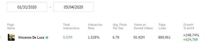 «Un impegno oggettivamente gravoso, che però porta i suoi frutti. Prima i suoi video si attestavano su alcune centinaia di migliaia di visualizzazioni. Da alcune settimane sfondano regolarmente il milione, con il picco, una settimana fa, di 2,3 milioni. Numeri enormi per un presidente di Regione, se si considera che, in piena emergenza, tra i video del collega Fontana – che amministra quattro milioni di abitanti in più – quello di maggiore successo raggiunge 1,2 milioni di visualizzazioni. Insomma, De Luca, le dirette Fb e la cifra spesa ci dicono che pure il governatore si è messo a giocare al gioco del più popolare. Comunicare sul Covid-19 istituzionalmente, da presidente, è doveroso, ma abbiamo visto come spesso e volentieri i suoi discorsi prendano anche pieghe politiche. Perché non sappiamo se e quando “andrà tutto bene”, ma sappiamo che, dopo quest’emergenza, in Campania prima o poi si voterà per le regionali».