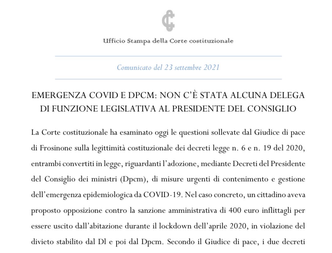 Nel caso concreto, un cittadino aveva proposto opposizione contro la sanzione amministrativa di 400 euro inflittagli per essere uscito dall’abitazione durante il lockdown dell’aprile 2020, in violazione del divieto stabilito dal Dl e poi dal Dpcm. Secondo il Giudice di pace, i due decreti legge avrebbero delegato al Presidente del Consiglio una funzione legislativa e perciò sarebbero in contrasto con gli articoli 76, 77 e 78 della Costituzione.