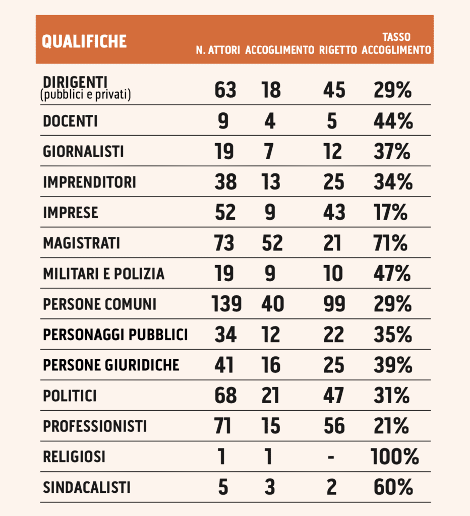 Nel caso si tratti di magistrati, ed è questo l’aspetto che non può non suscitare sorpresa, la domanda viene accolta in ben sette casi su dieci. Esattamente il contrario, dunque tre accoglimenti su dieci, quando il denunciante appartiene ad una qualsiasi altra categoria professionale (giornalista, politico, professore, imprenditore, ecc.). Per quanto concerne invece gli importi, la media è di circa ventimila euro, esattamente il doppio per le toghe. Difficile non pensare, considerato il differente esito processuale, all’esistenza di una “giustizia domestica” fra i magistrati per questo genere di cause: il giudice che decide sulla denuncia per diffamazione del collega sa che quest’ultimo un domani potrà fare altrettanto. Un magistrato, ex Pm di Mani pulite, nel quinquennio in questione è riuscito ad imbastire oltre venti cause ottenendo un risarcimento complessivo di quasi seicentomila euro. Il convenuto è quasi sempre un mezzo di comunicazione di massa, quotidiano o programma televisivo, che poi corrisponde l’importo liquidato in quanto debitore di ultima istanza, anche rispetto ai propri giornalisti.
