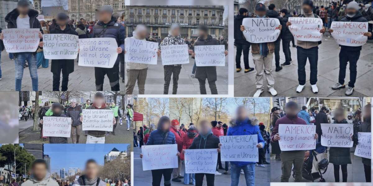 Secondo Le Monde, dal dicembre 2022 ad oggi dieci azioni contro l’Ucraina sarebbero state organizzate a Parigi, L’Aia, Madrid e Bruxelles e diffuse sui social network. Il processo è sempre lo stesso: alcuni uomini si recano a manifestazioni estranee alla guerra in Ucraina e si fotografano tra la folla, con cartelli con messaggi identici: “NATO, smetti di bombardare Donetsk” e “Non inviare più armi all’Ucraina! Zelensky sta bombardando Luhansk e Donetsk”. Alcuni pseudo-dimostranti hanno partecipato a diverse manifestazioni nel giro di pochi giorni: uno di loro, presente a una manifestazione sul clima all’Aia il 28 gennaio, si è ritrovato a Bruxelles tre giorni dopo, questa volta nel mezzo di una manifestazione intersindacale degli operatori sanitari.