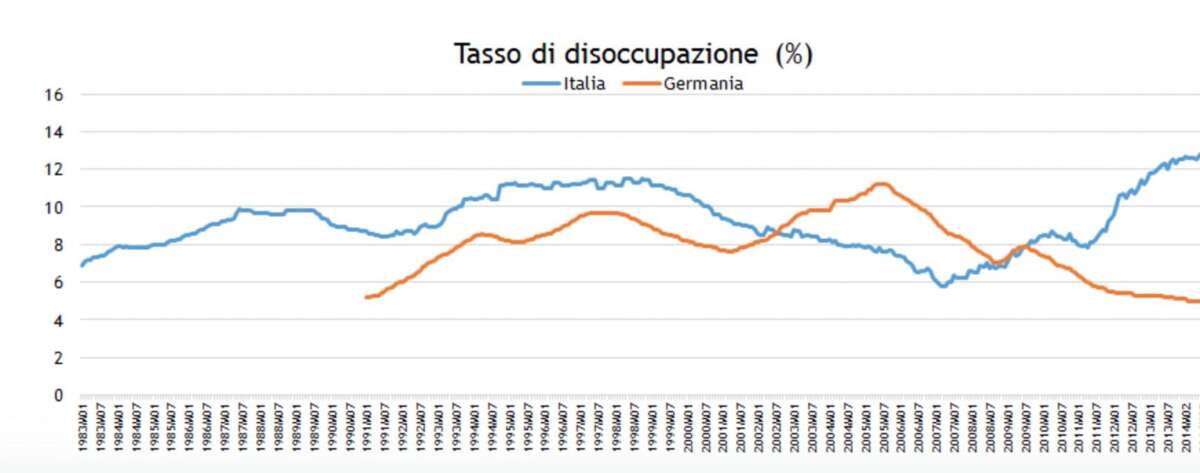La controprova arriva dal grafico sul tasso di disoccupazione pubblicato da ‘Keynes Blog’, dove si evidenzia come “dopo l’introduzione dell’euro la disoccupazione in Germania ha superato quella italiana”.