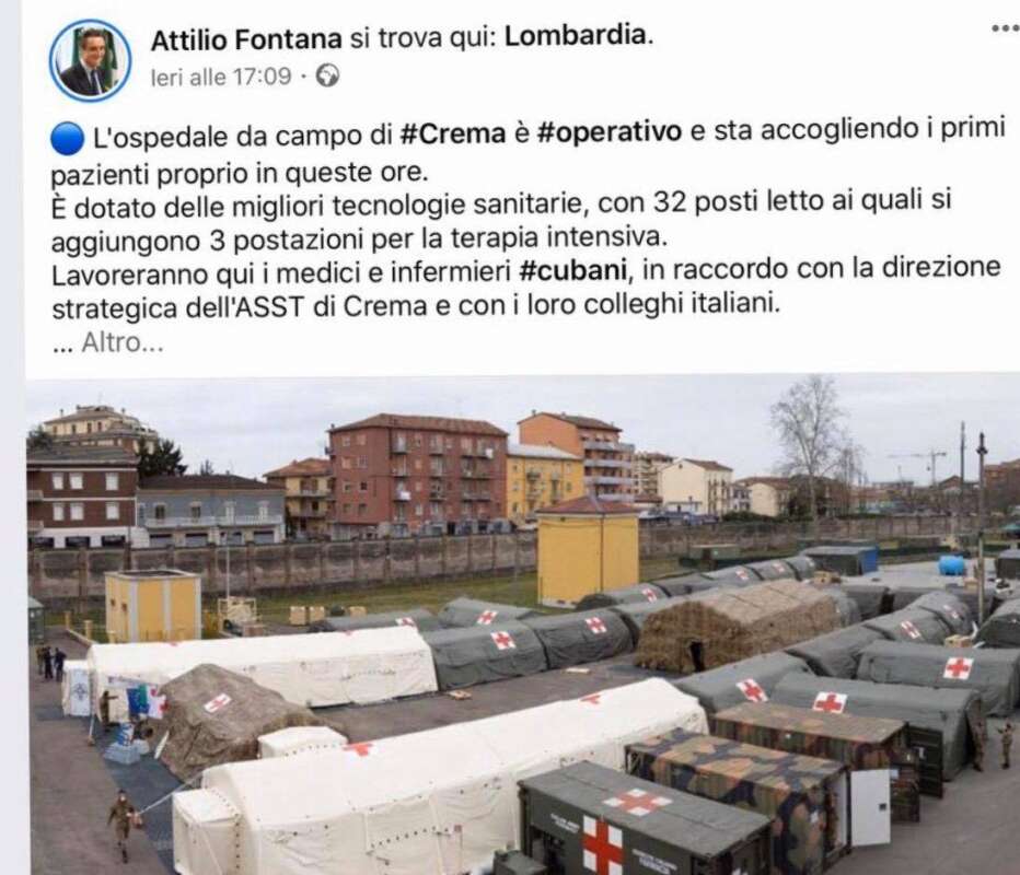 L’ospedale da campo di Crema è pienamente “operativo e sta accogliendo i primi pazienti in queste ore”, dotato “delle migliori migliori tecnologie sanitarie, con 32 posti letto ai quali si aggiungono 3 postazioni per la terapia intensiva”, e via di foto a corredo del post.